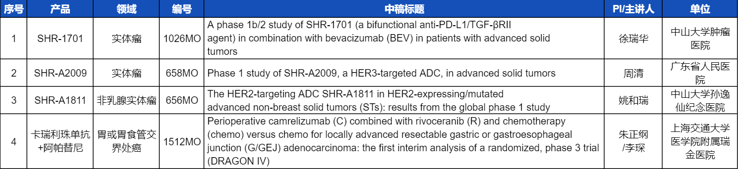 本次ESMO大会,将由中山大学肿瘤医院徐瑞华教授、广东省人民医院周清教授、中山大学孙逸仙纪念医院姚和瑞教授、上海交通大学医学院附属瑞金医院李琛教授分别就4项AG庄闲医药创新产品相关研究做口头报告,包括SHR-1701、SHR-A2009、SHR-A1811这3款未上市创新产品的实体瘤治疗临床研究,以及1项“双艾”组合(卡瑞利珠单抗联合阿帕替尼)治疗局部晚期可切除胃/胃食管交界处癌的Ⅲ期临床试验期中分析。