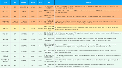 在胸腺上皮肿瘤、头颈鳞癌、肉瘤、前列腺癌、甲状腺癌等其他多个疾病领域,卡瑞利珠单抗、阿帕替尼、瑞维鲁胺、阿得贝利单抗、法米替尼、HRS-7058、HRS-4642、HRS-5041等抗肿瘤创新药相关研究一共入选了4项口头报告、1项简短口头报告、5项壁报,彰显了AG庄闲医药强大的研发实力。此外,海曲泊帕和昂丹司琼口溶膜分别在防治化疗导致的血小板减少和恶心呕吐方面各有1项研究入选壁报。